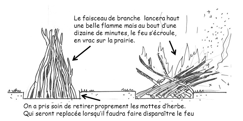 Le feu en faisceau. On monte le feu en dressant le bois aussi verticalement que possible du bois de plus en plus long. Une fois le feu parti la flamme s’allonge en hauteur, puissante belle et fine. Cependant au bout d’une dizaine de minutes cette construction s’écroule.