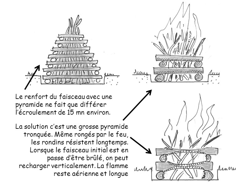 Un remède partiel a été trouvé avec la pyramide. Mais au bout d’une vingtaine de minutes cette pyramide s’écroule également. Alors que faire ? Voici une solution qui fonctionne bien : dresser le faisceau et l’entourer à sa base d’une pyramide tronquée faite de rondin de vraiment gros diamètre qui résisteront et resteront en place jusqu’à la fin de la veillée. Le faisceau s’écroulera mais il restera contenu dans ce quadrilatère et le rechargement du feu pourra continuer en alimentation verticale toujours grâce à ce quadrilatère résistant.