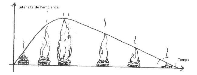 Et à la fin, On se calme tranquillement en faisant descendre progressivement le rythme des activités. La courbe ne doit pas baisser trop vite : les scouts ne doivent pas avoir une impression de coupure. Cette baisse progressive doit permettre aux scouts de se coucher dans le calme, sans être trop énervés.